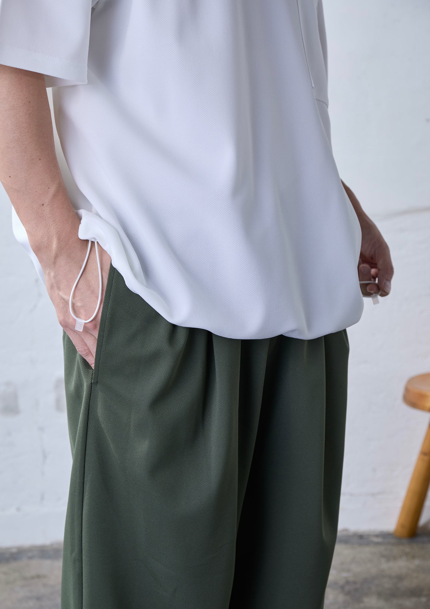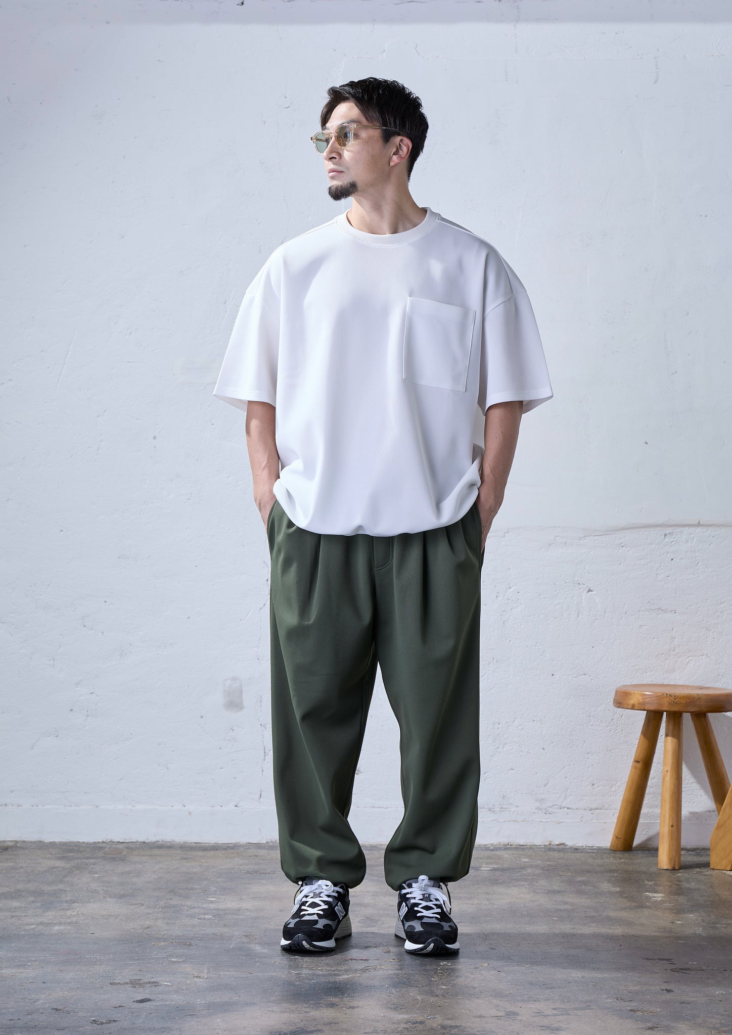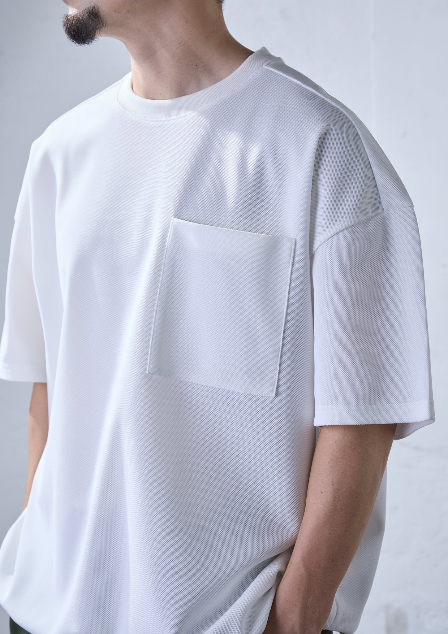 裾口の両側にドローコードが入っていて、胸ポケットがついた一見なんてことのないデザイン。しかし、身幅にゆとりを持たせつつ、バランスの取れた長すぎない丈感や、視覚的な切り替えとなり、スッキリとした印象を与える肩線の縫い目。顔が大きく強調されないようリブを一般的なTシャツよりも太めに設定するなど、大柄の方が着ることだけを想定した仕様となっています。