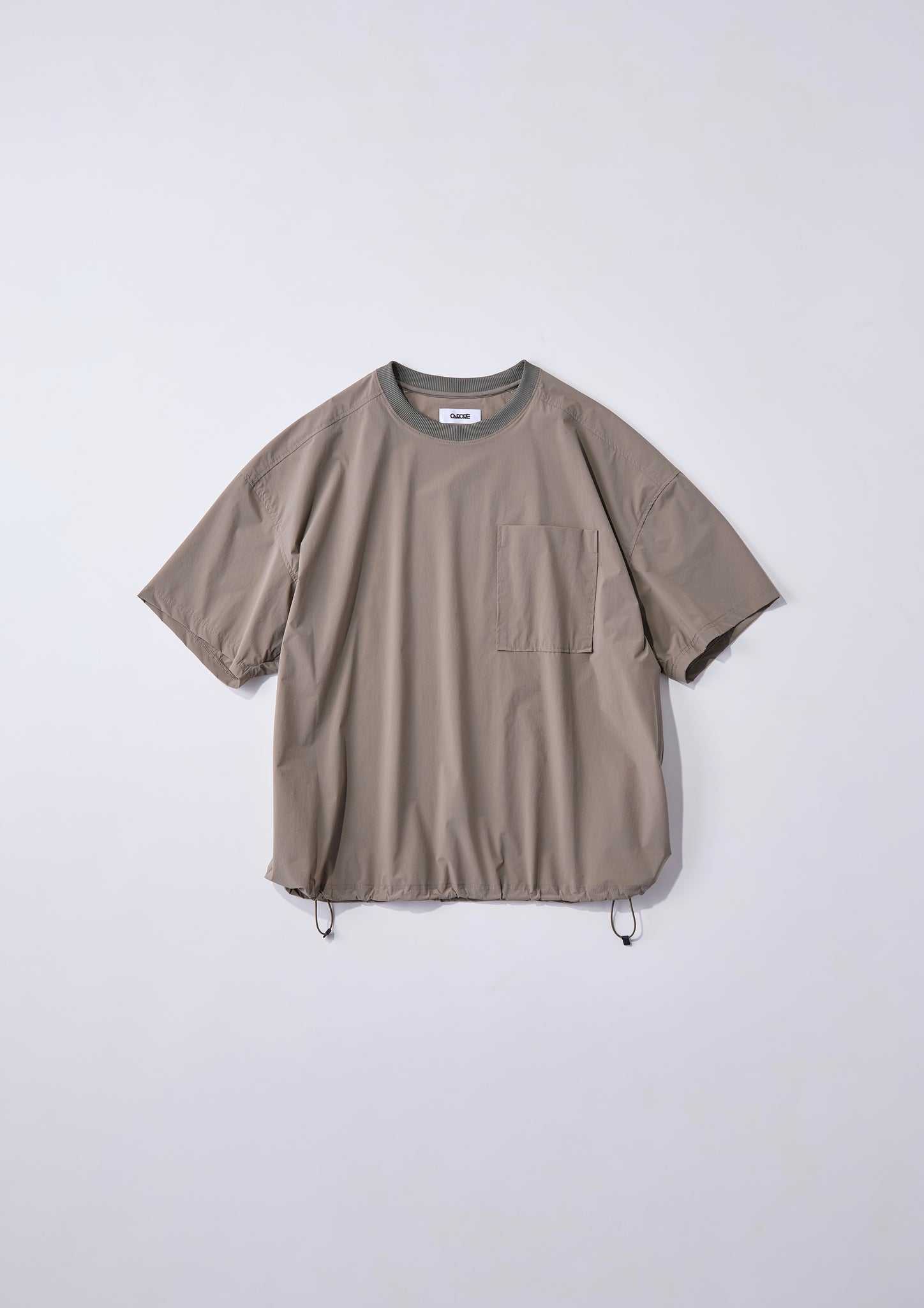 シルエットは、身幅にゆとりを持たせつつ、長すぎない丈感でバランスの取れた仕上がりに。肩線の縫い目が前見頃にくるようにすることで、視覚的な切り替えとなり、スッキリとした印象を与える仕様を採用しています。リブは、一般的なTシャツよりも太めに設定することで、顔が大きく強調されないよう配慮。裾口にはドローコードを採用し、体型や、その日の気分に合わせてシルエットや丈感を調整できる仕様となっています。