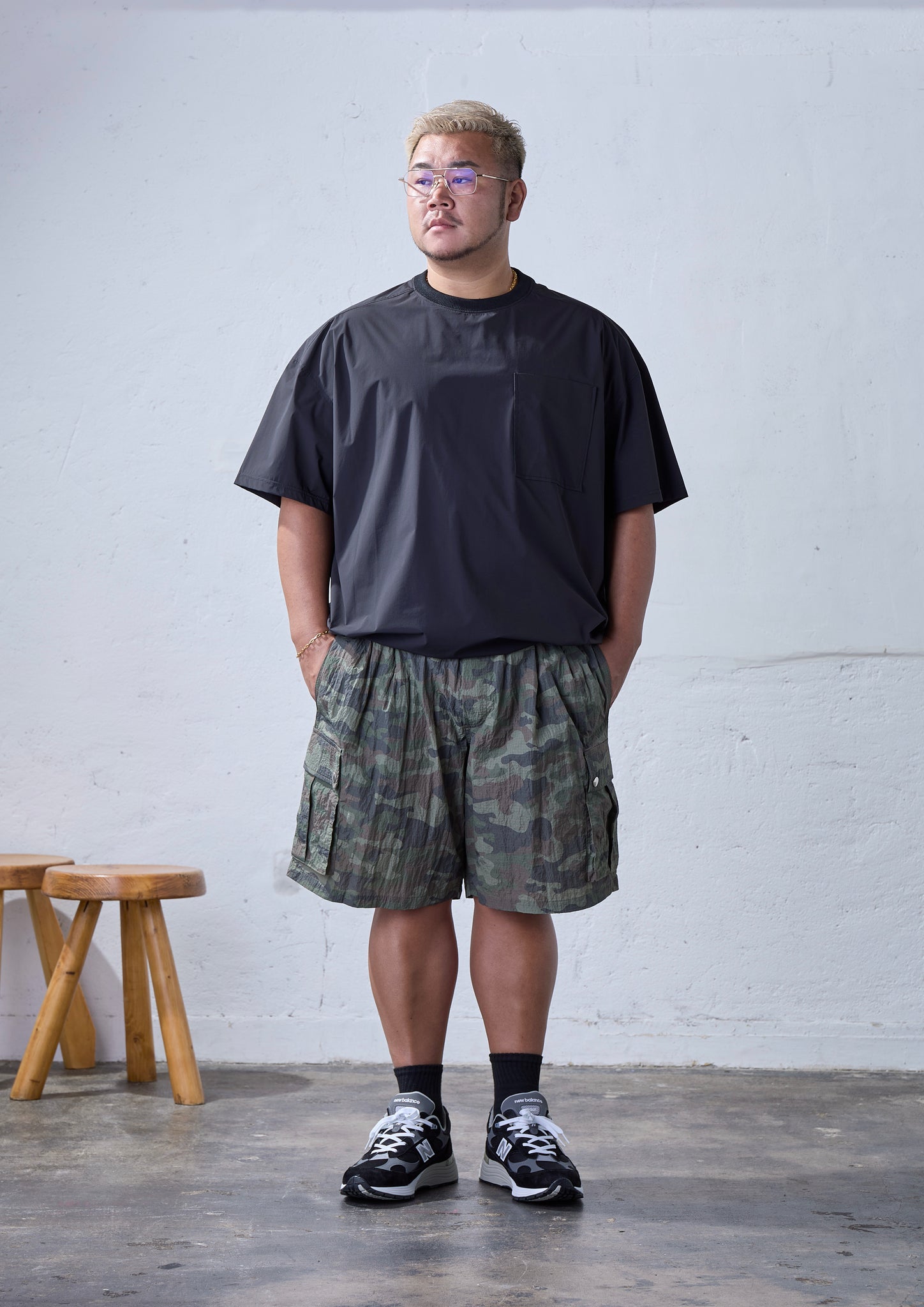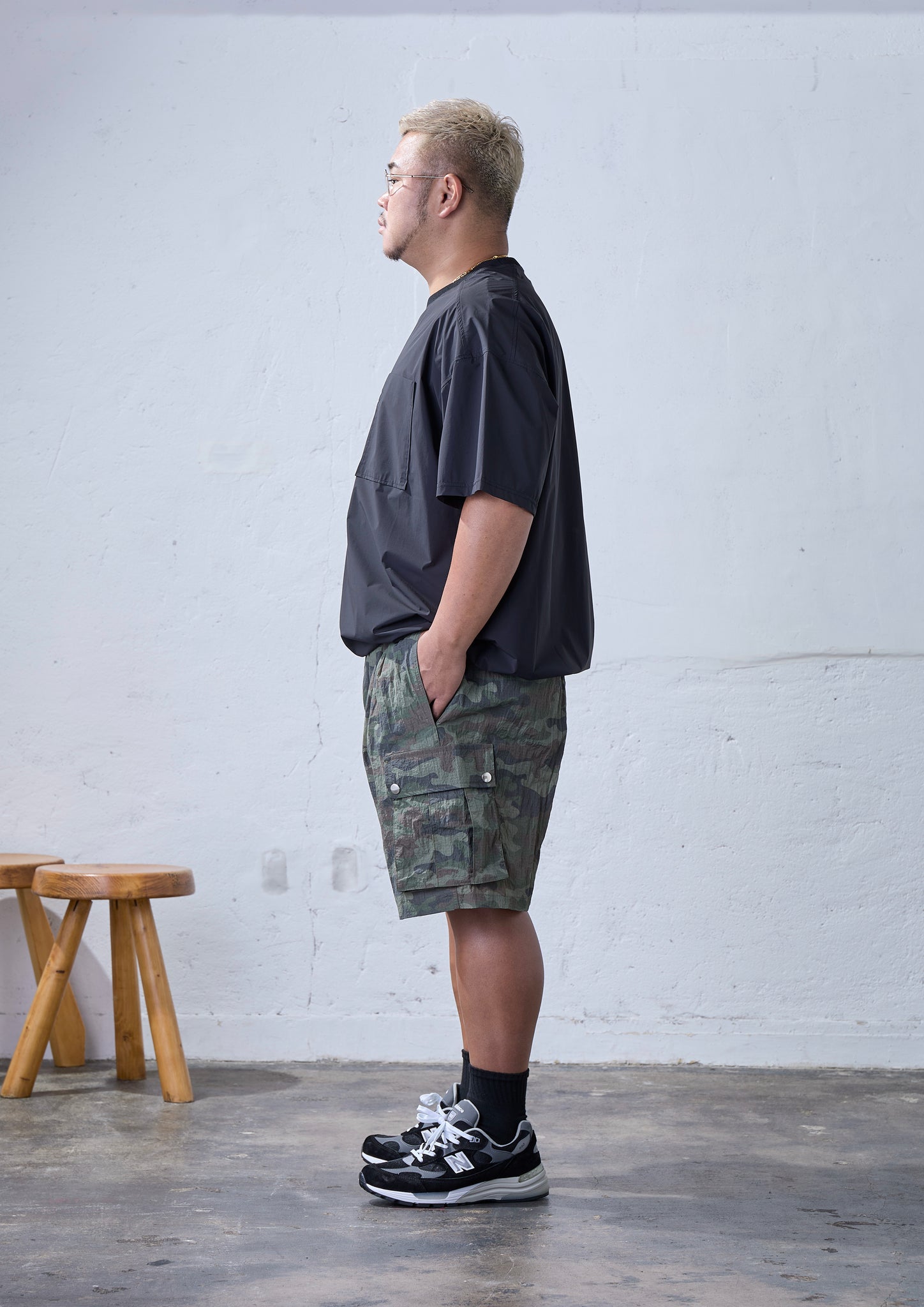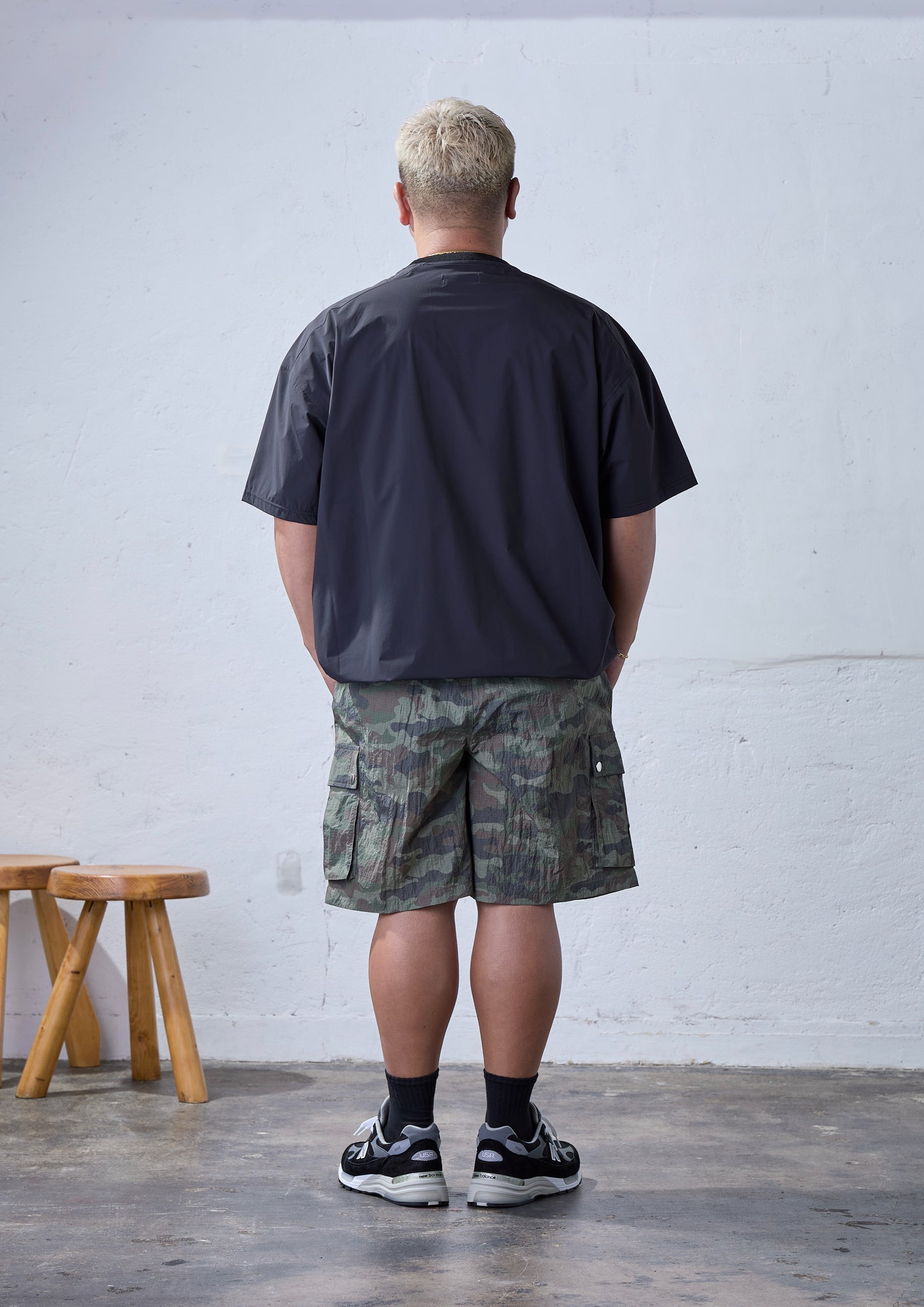 どうしてもミリタリーのアイテムや迷彩柄は「土臭さ」が出てしまい、大柄の方が着ると清潔感がない印象を与えてしまいがち。それでもナイロンを使ったり、2タックを入れたり、メタルボタンを効かせてモダンに仕上げることで、「変に似合いすぎている感」を払拭できたと思います。