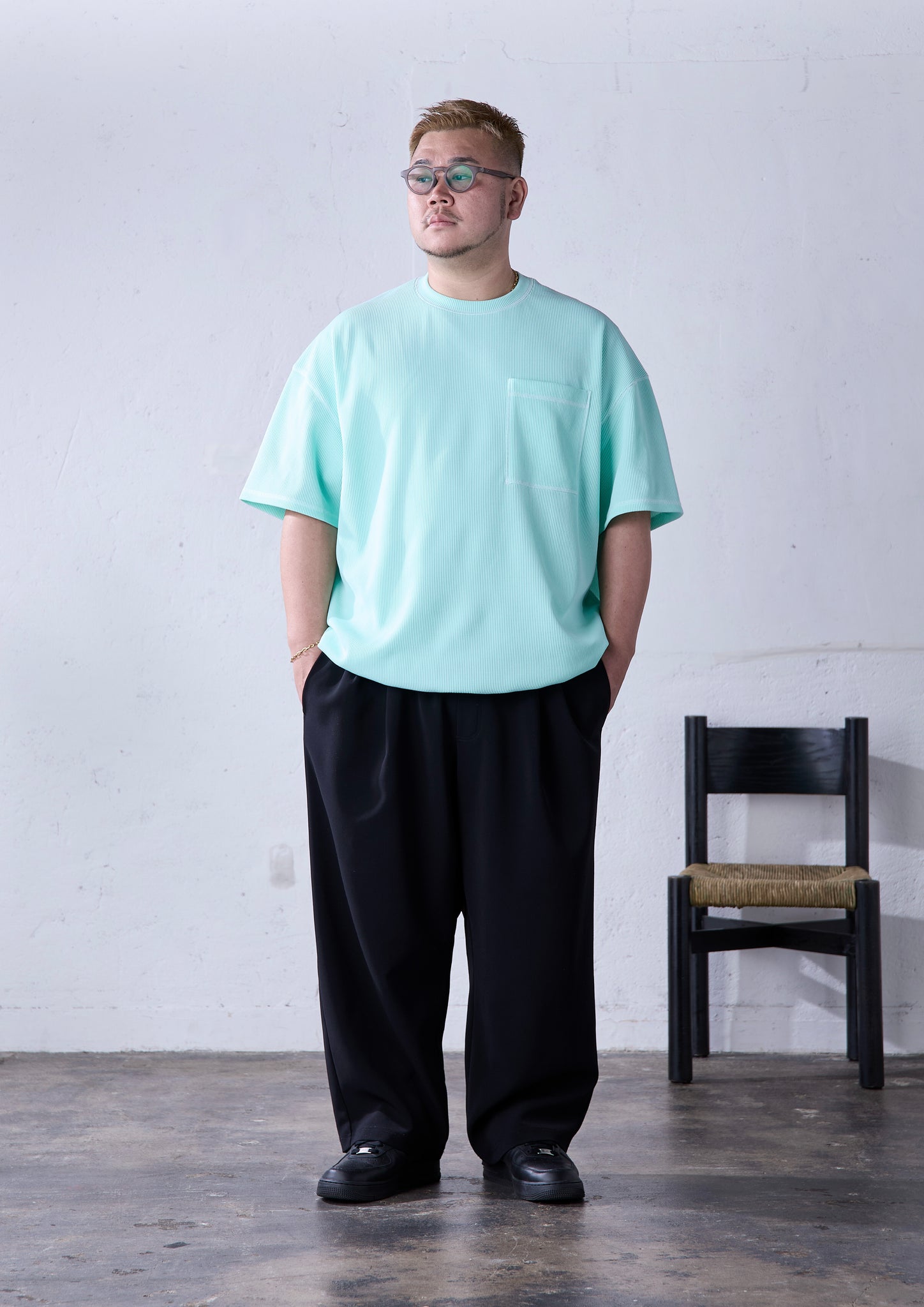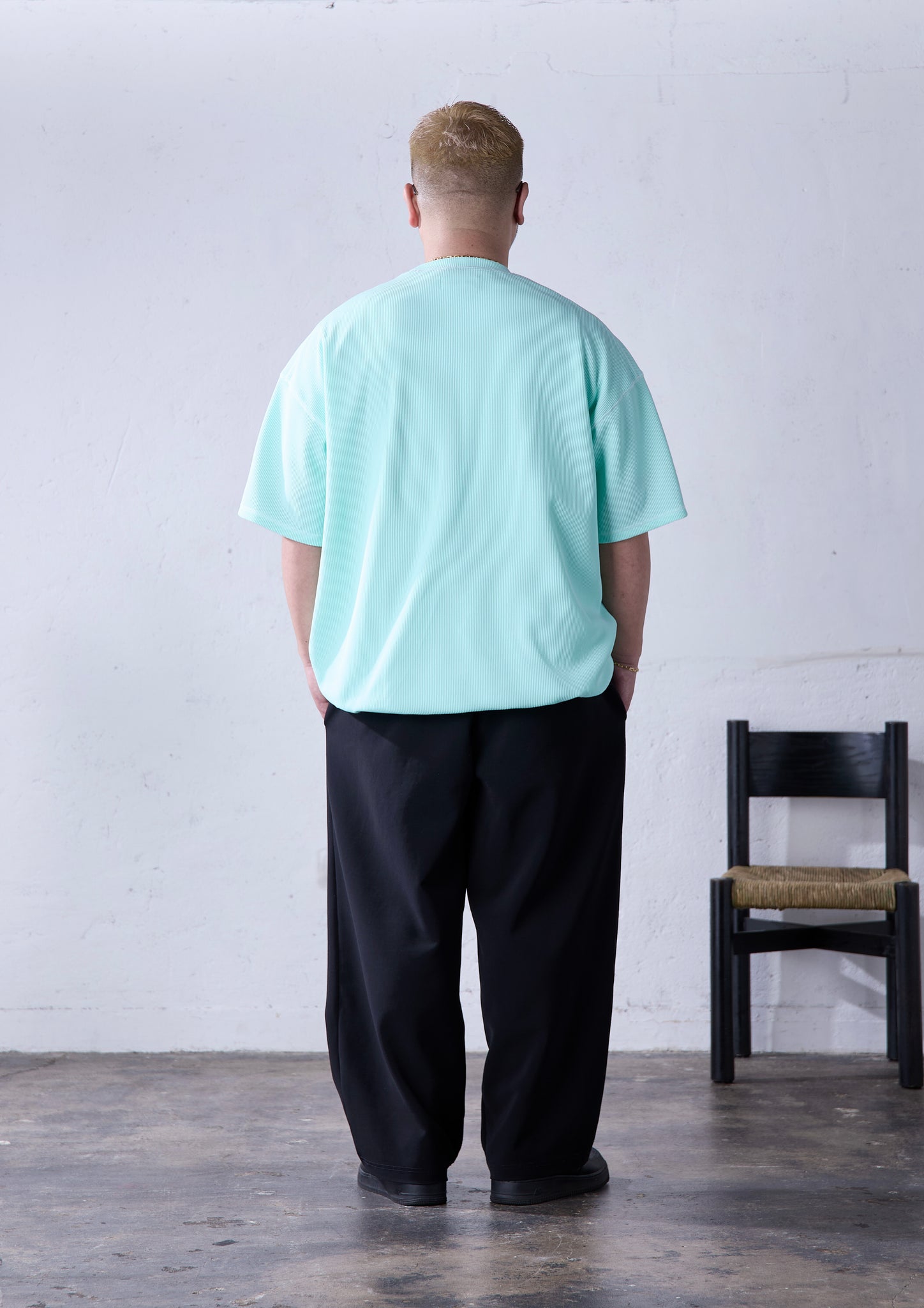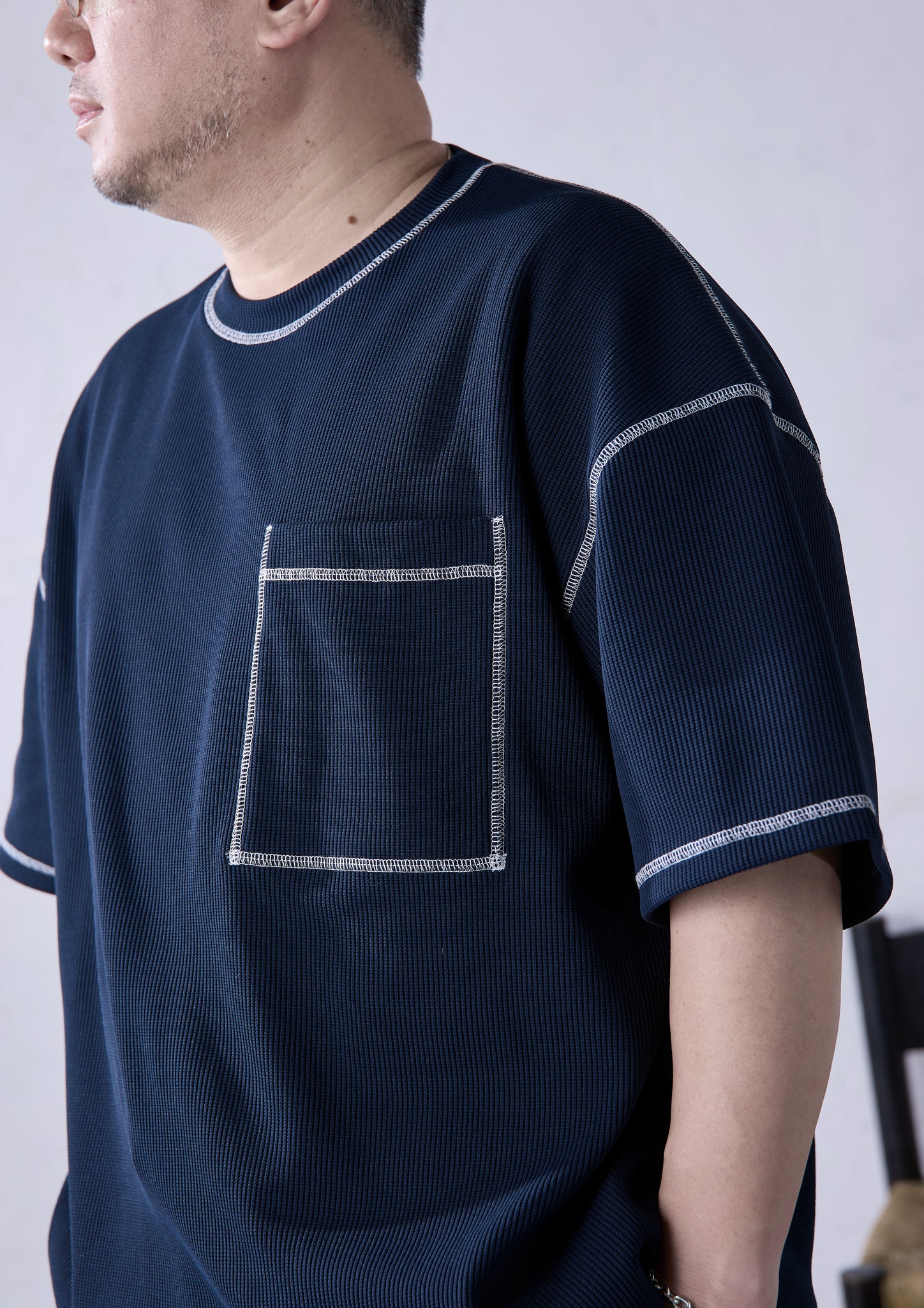 ワッフル素材というと、秋冬のイメージが強い素材。一方この生地は「エアワッフル」の名前の通り、軽くて、透かすと透けて見えるくらい通気性の良いものを採用。生地の凸凹した表情感があることで肌離れがよく、薄手ながら身体のラインを拾いづらいという、大柄の方が着用するにあたって、とても理に適った生地になっています。適度なストレッチ感や、繰り返し着用しても毛羽立ちにくいことも特徴です。