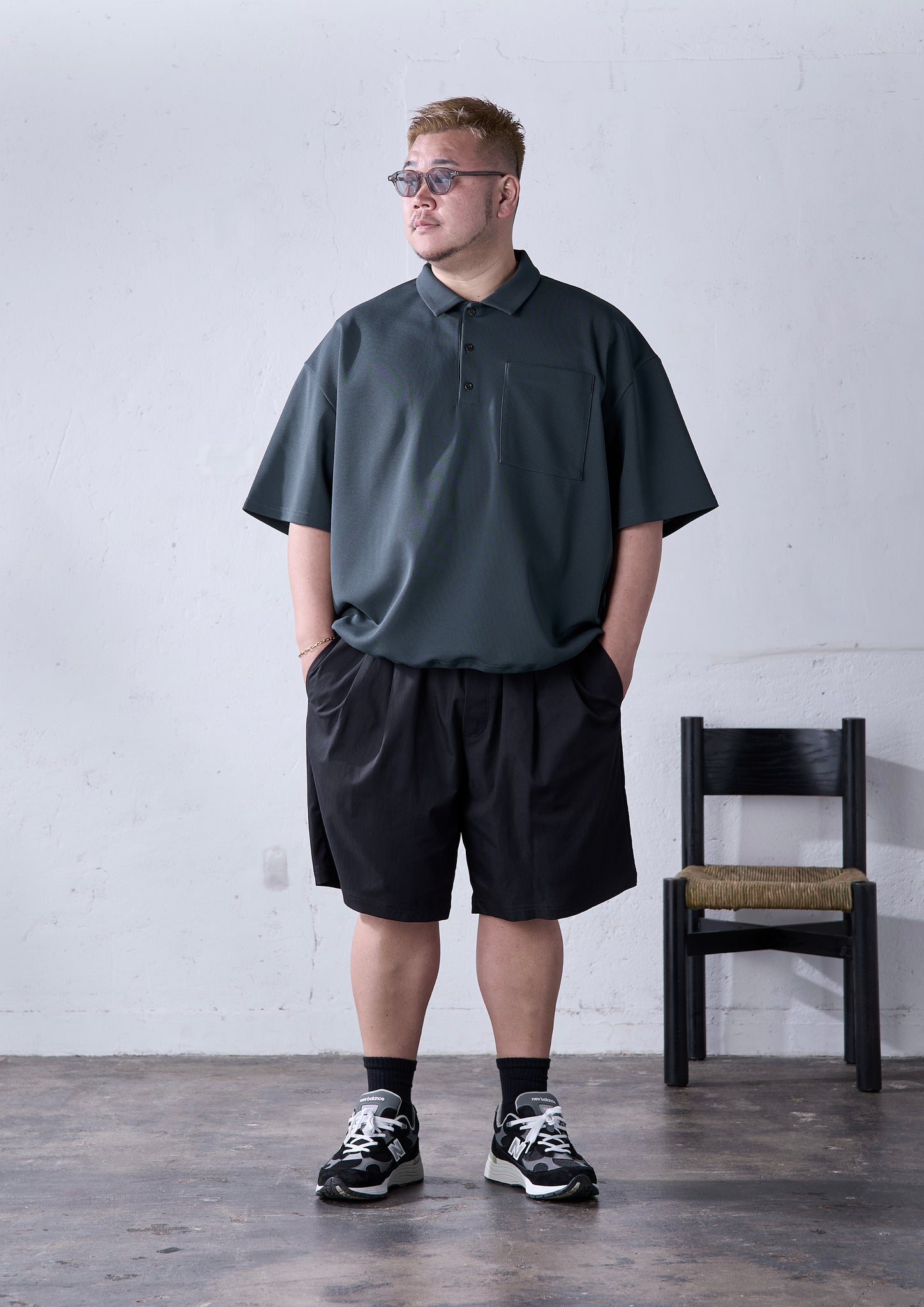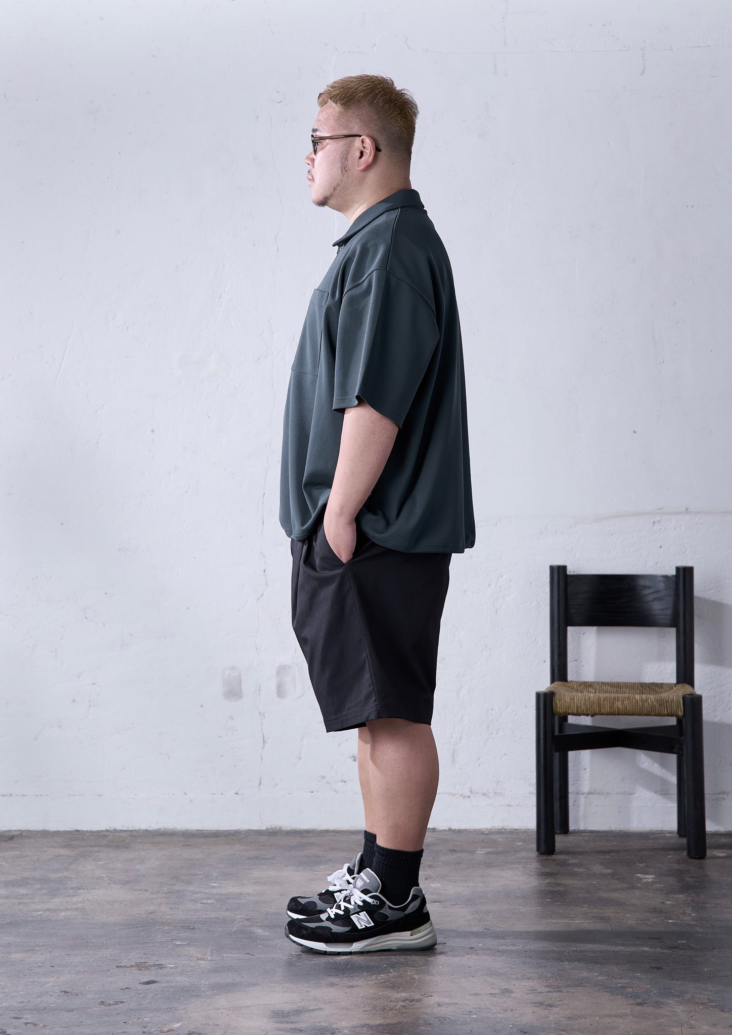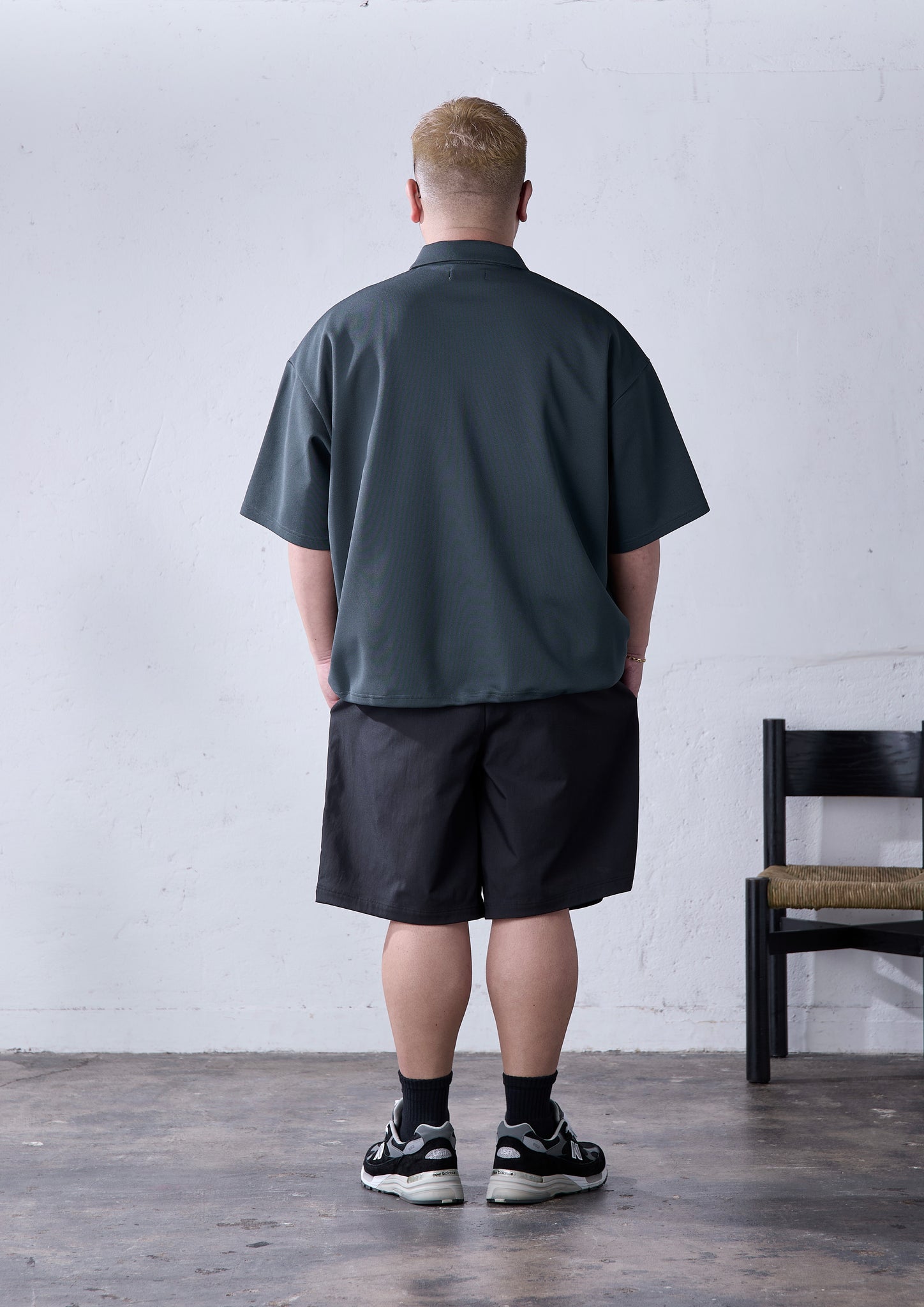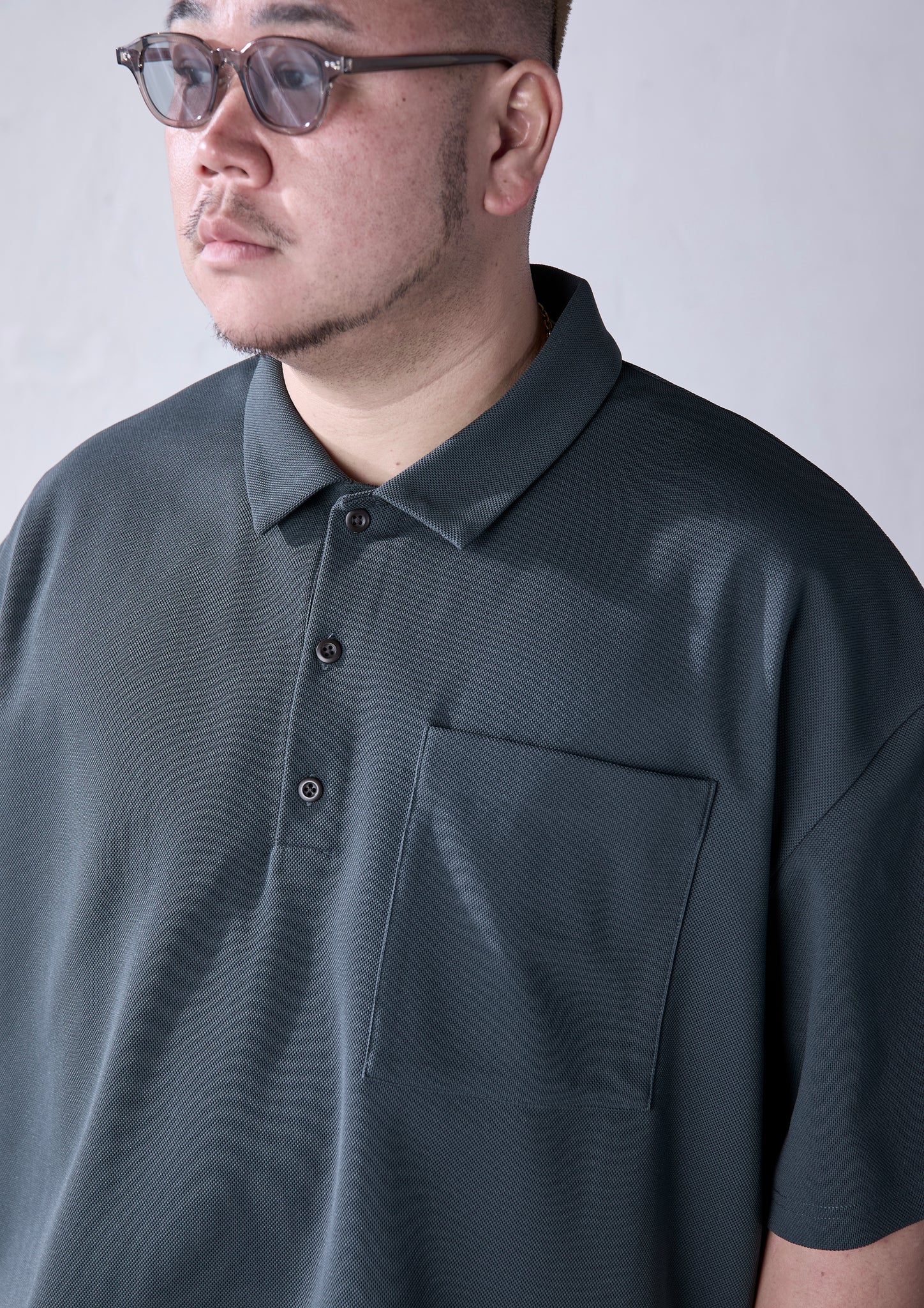 carorieを買っていただいているお客さんの中でも、ポロシャツはなんか「お父さんっぽくなる」という理由で敬遠される方も一定数いて。ポロシャツは紳士服由来のものゆえに、身幅がタイトで、僕たち大柄が着られるものを探すと結果的に着丈が長くなって、身体のラインも拾ってしまう、というのがその原因だと思います。でも、carorieはご覧の通り大柄の方でもゆったり着られるだけの身幅をとっているので、一般的なポロシャツとは一線を画しているのがお分かりいただけると思います。