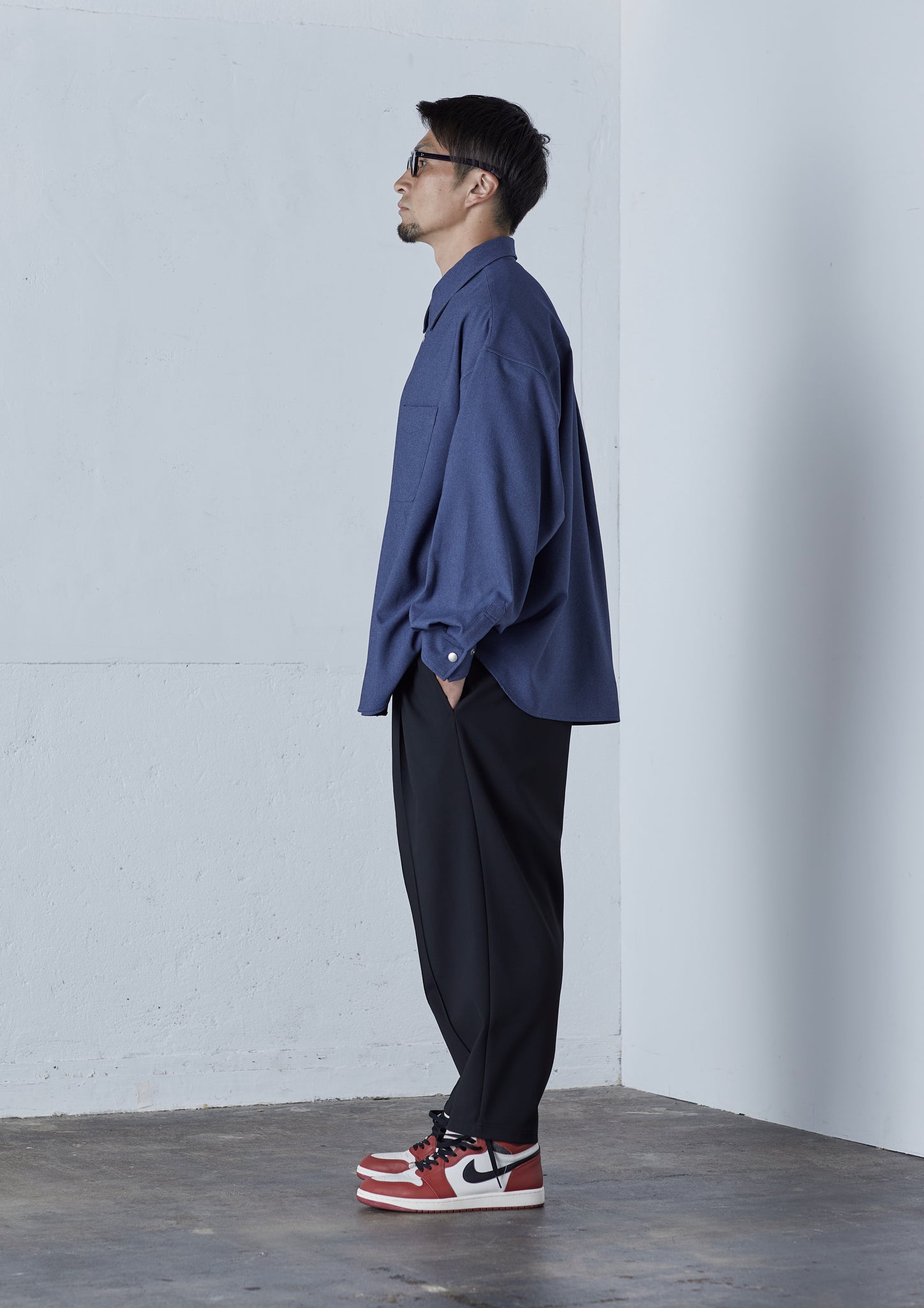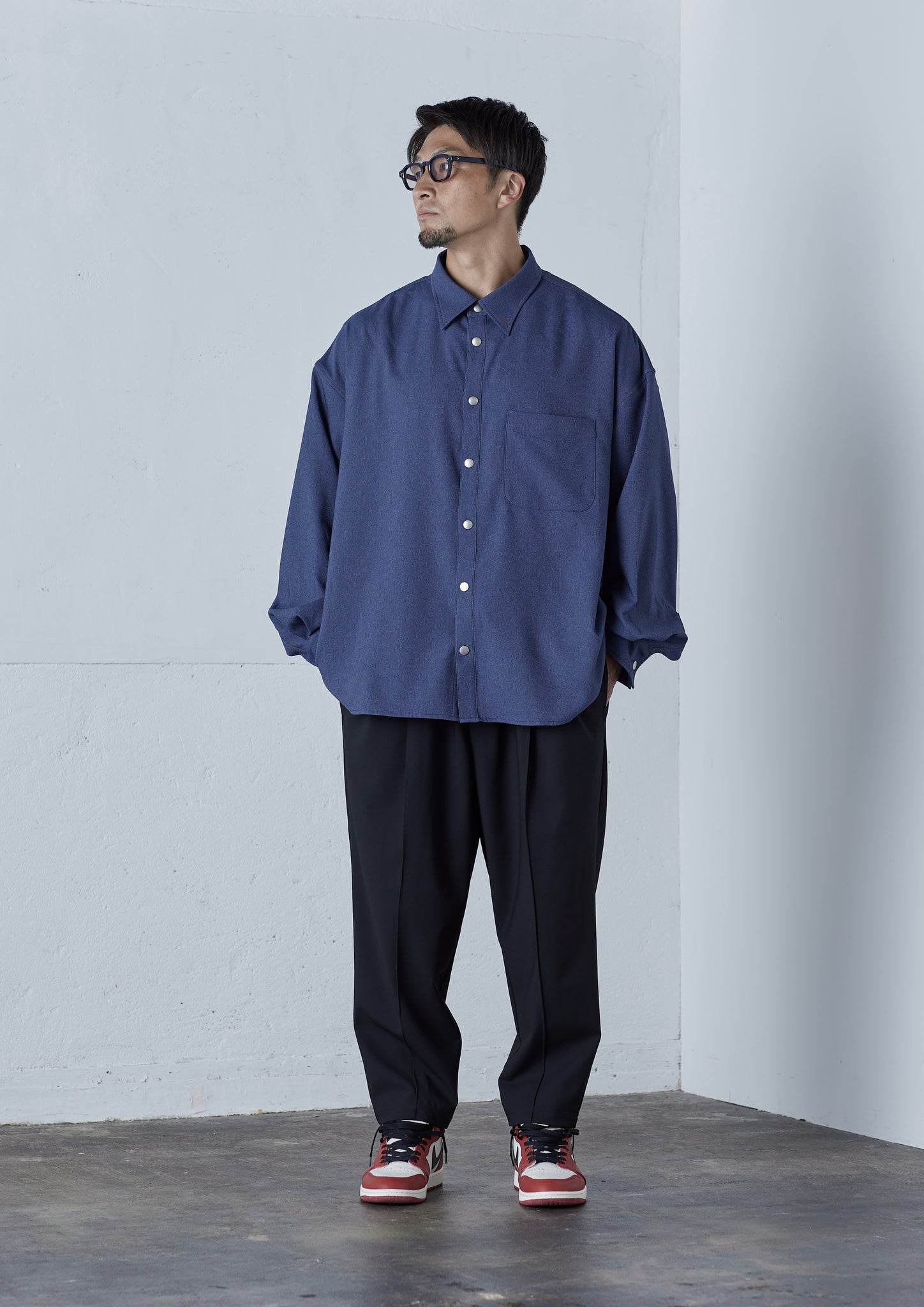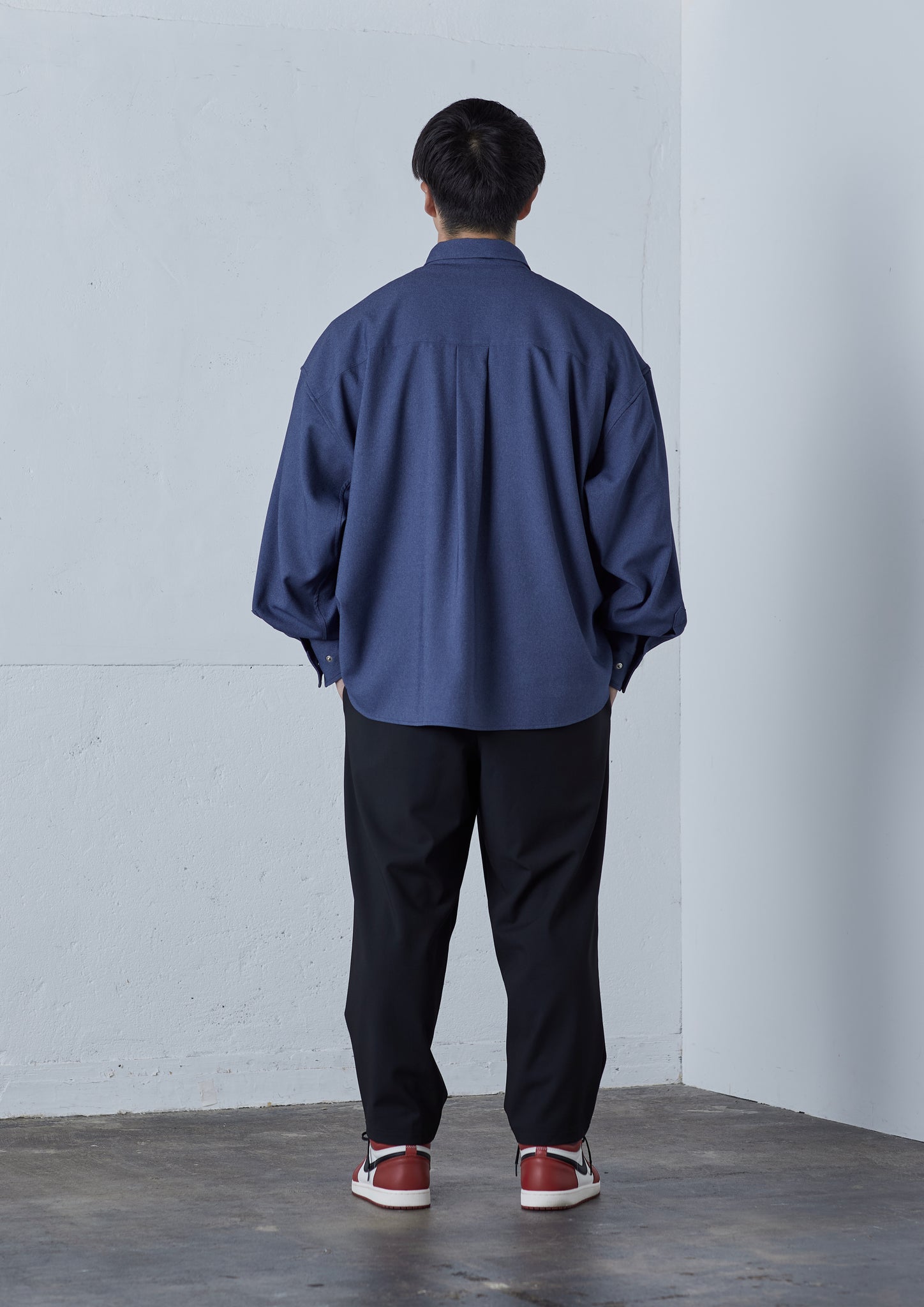 大柄の方がゆったりと着られるよう、後ろ見頃にはタックを入れ、身幅は広めに。第1ボタンまできちんと閉まるよう首回りは広めに設計し、なおかつ窮屈さを感じづらいよう台襟の高さを通常より低めにしています。一般的なオーバーサイズのシャツでは、「オーバーサイズになっていない」ことで窮屈さを感じるアームホールも、通常のシャツよりも太めの仕様にし、袖口の広さはスナップボタンによって二段階で調整ができるようになっています。
