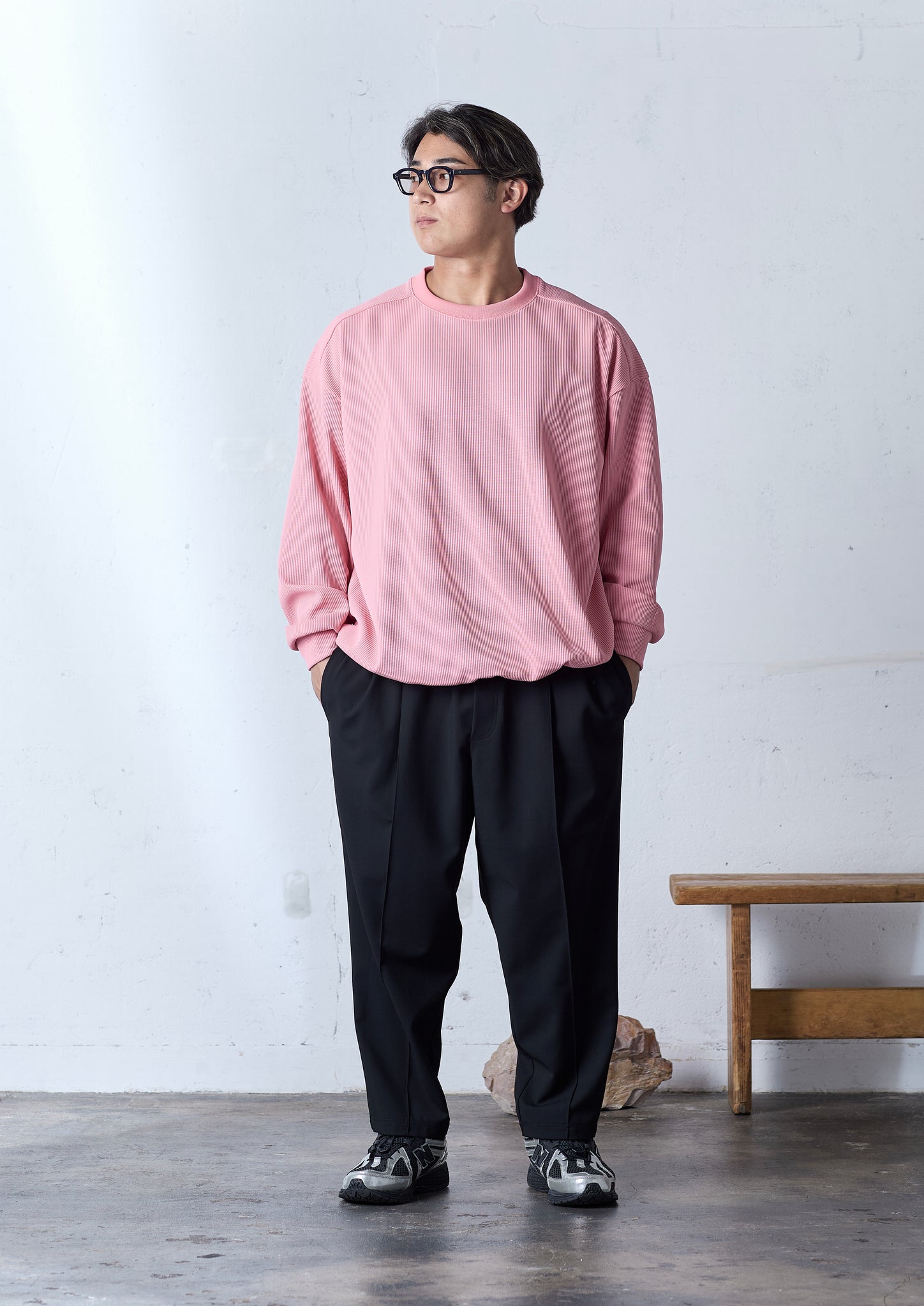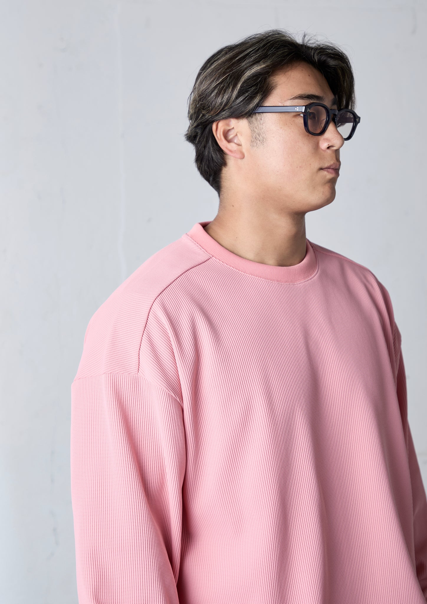 ワッフルというと、秋冬のイメージが強い素材。それを今回は、透かすと透けて見えるくらい通気性の良いものを採用。生地の凸凹した表情感があることで肌離れがよく、薄手ながら身体のラインを拾いづらいという、大柄の方が着用するにあたって、とても理に適った生地になっています。適度なストレッチ感や、繰り返し着用しても毛羽立ちにくいのも特徴です。