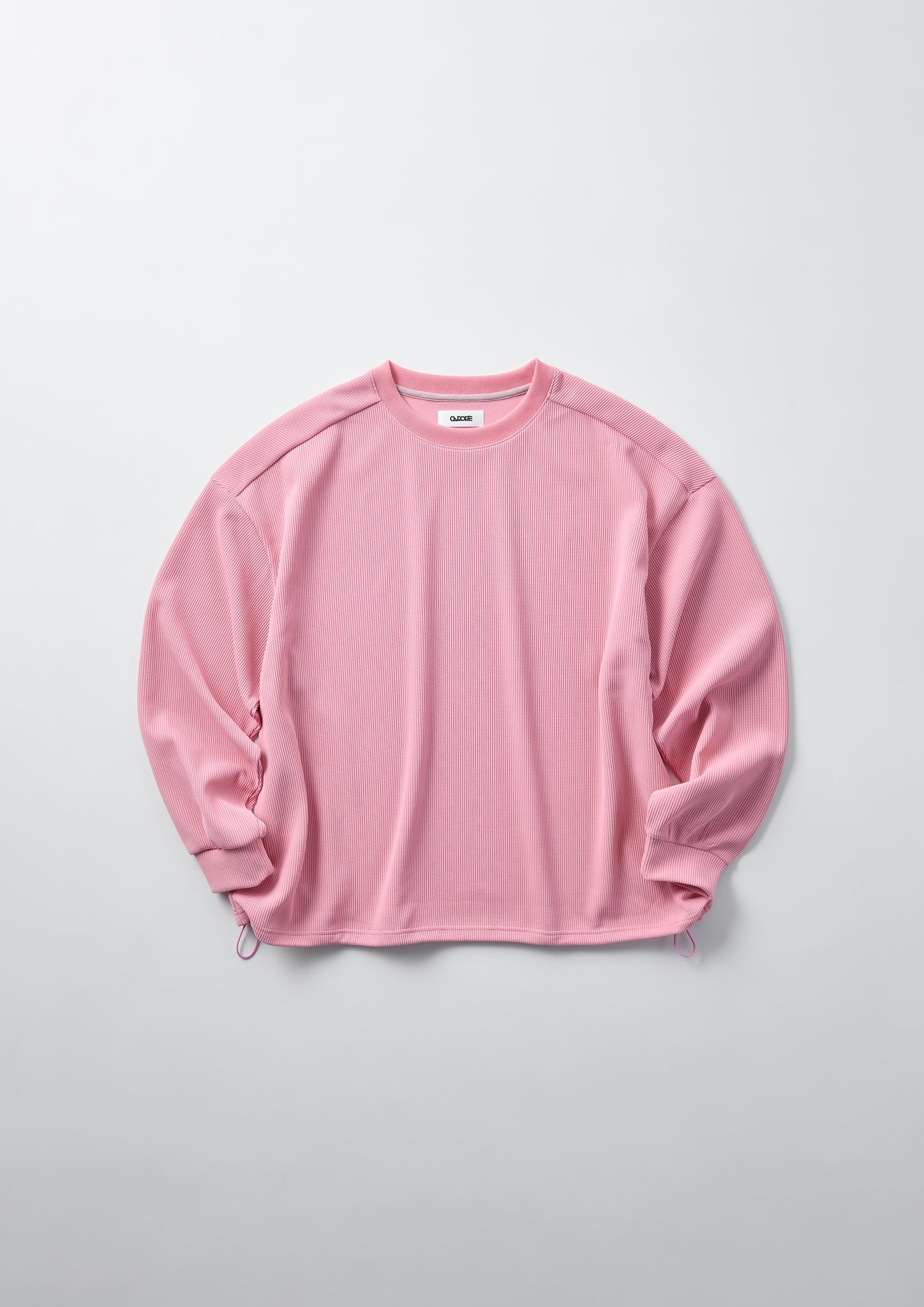 通常よりも広めの首回りは、着脱しやすいだけでなく、リブも通常よりも太めにすることで、顔の大きさが強調されにくいよう配慮しています。裾口は、両脇にドローコードを採用。体型や、その日の気分に合わせてシルエットや丈感の調整が可能です。