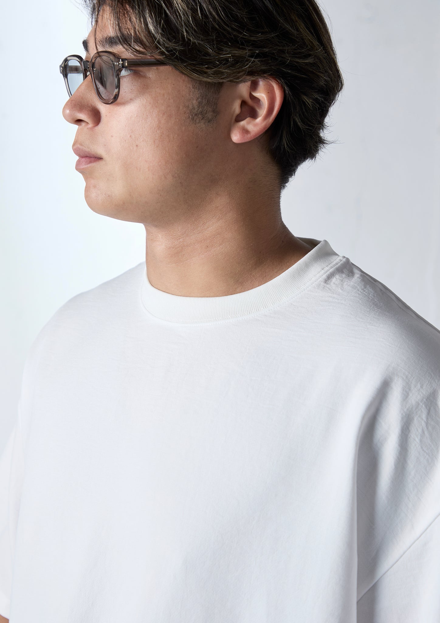 その代わりにおすすめしたいのが、このTシャツ。生地に必要最低限の肉感があるから、着たときの安心感があって、汗をかいても肌にまとわりつきづらい。着心地はもちろん、見た目もジャケットの下に着る前提で極力デザインを入れず、ミニマルでスマートにしています。この快適さと軽さを経験したら、他のTシャツは着れなくなる。そう思える一着です。ぜひ、同素材のノーカラージャケットやシャツと共に着用いただけると嬉しいです。