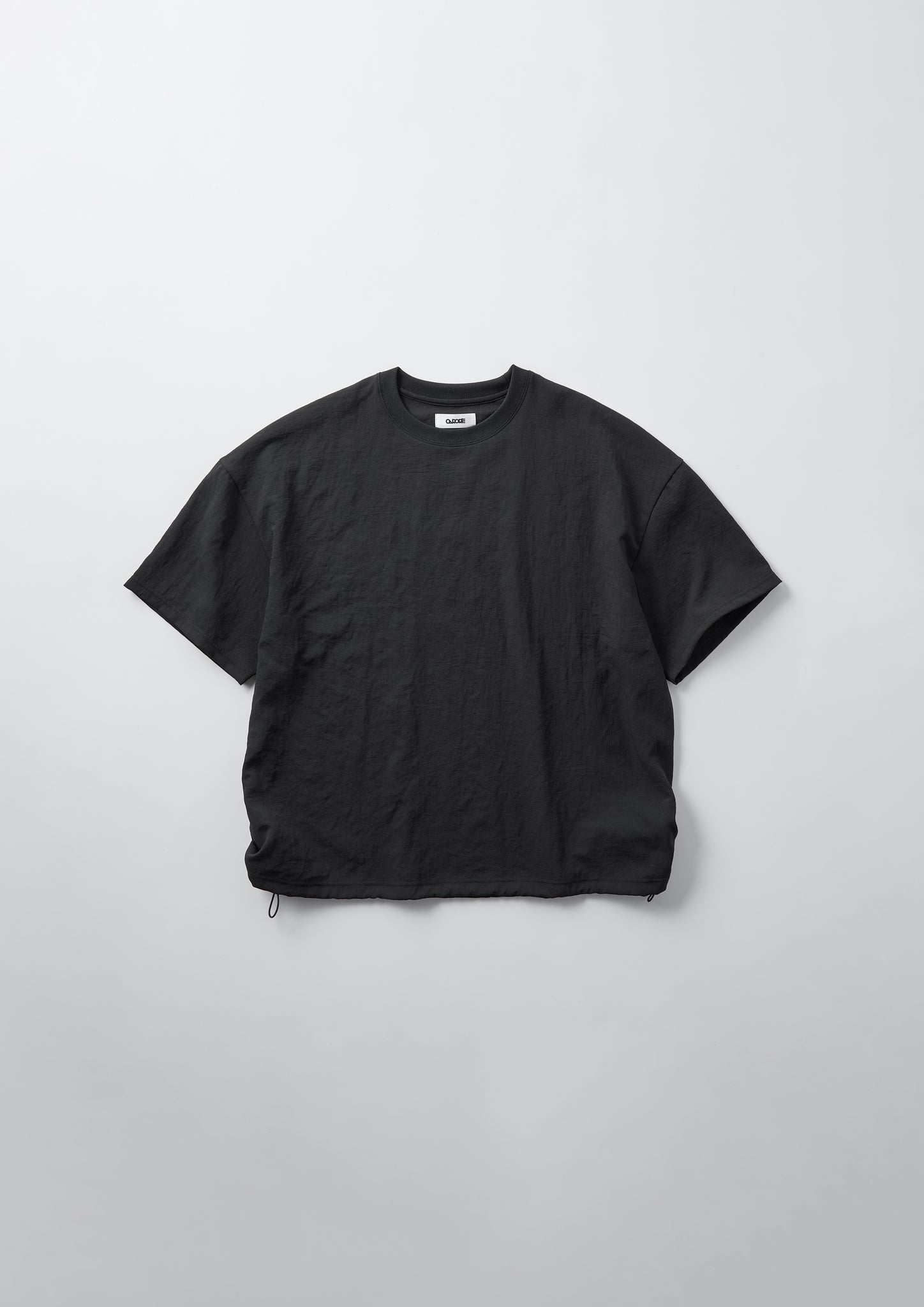 シルエットは、身幅にゆとりを持たせつつ、長すぎない丈感でバランスの取れた仕上がりに。大柄の方が着用した際、胸やお腹の突っ張りを軽減するため、肩の縫い目を通常より後ろにし、前見頃の生地を多めにとるパターンを採用しています。リブも、一般的なTシャツよりも太めに設定することで、顔が大きく強調されないよう配慮。裾口にはドローコードを採用し、体型や、その日の気分に合わせてシルエットや丈感を調整できる仕様となっています。
