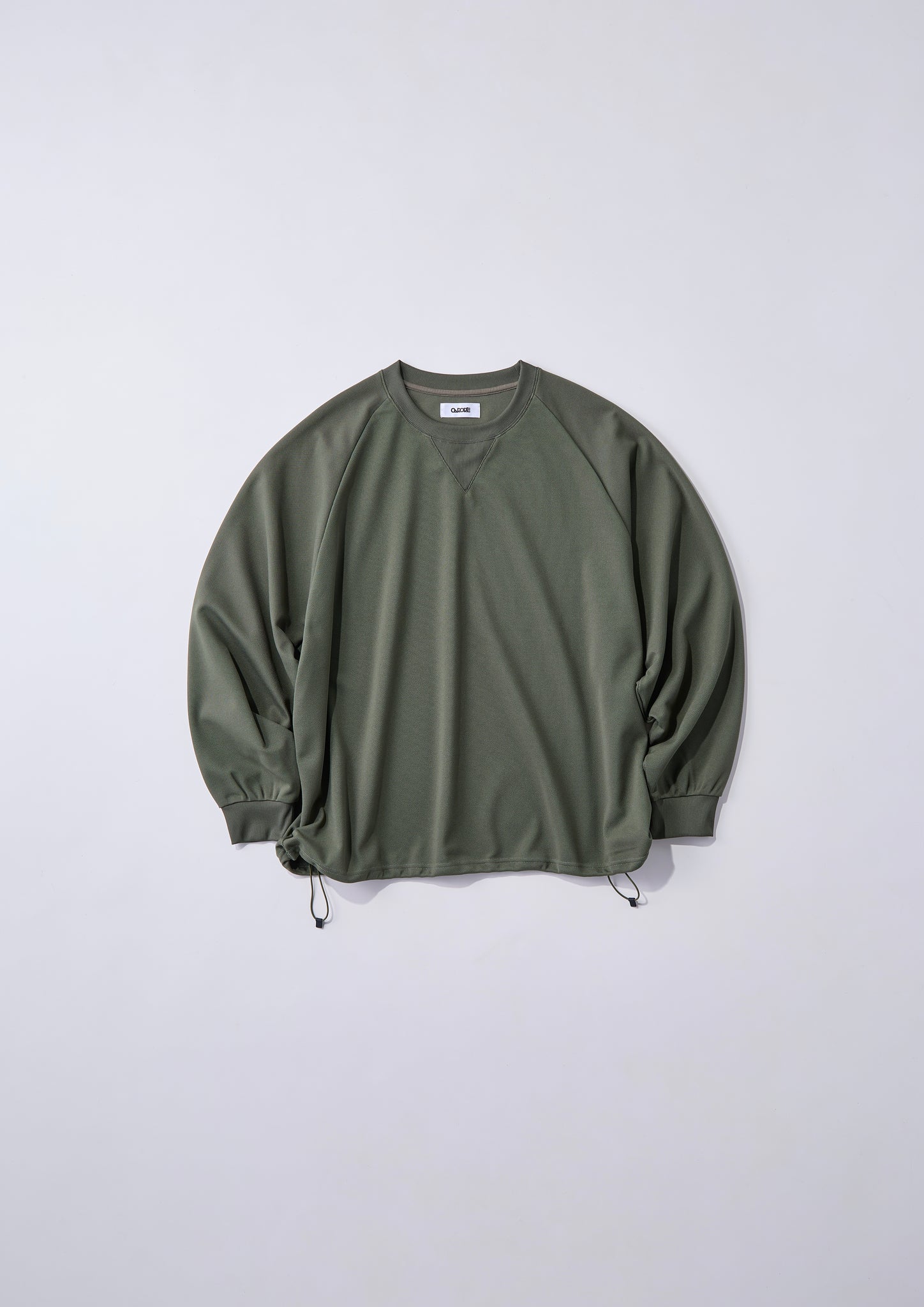 carorieらしく、身幅にゆとりを持たせつつ、長すぎない丈感でバランスの取れたシルエット。袖はラグランスリーブにすることで、腕や肩を動かしやすく、肩がなだらかに落ちてリラックスした印象に。また、一般的なTシャツよりも襟のリブを太めに設定することで、顔が大きく強調されないよう配慮。裾口にはドローコードを採用しているため、体型やその日の気分に合わせてシルエットや丈感を調整することが可能です。