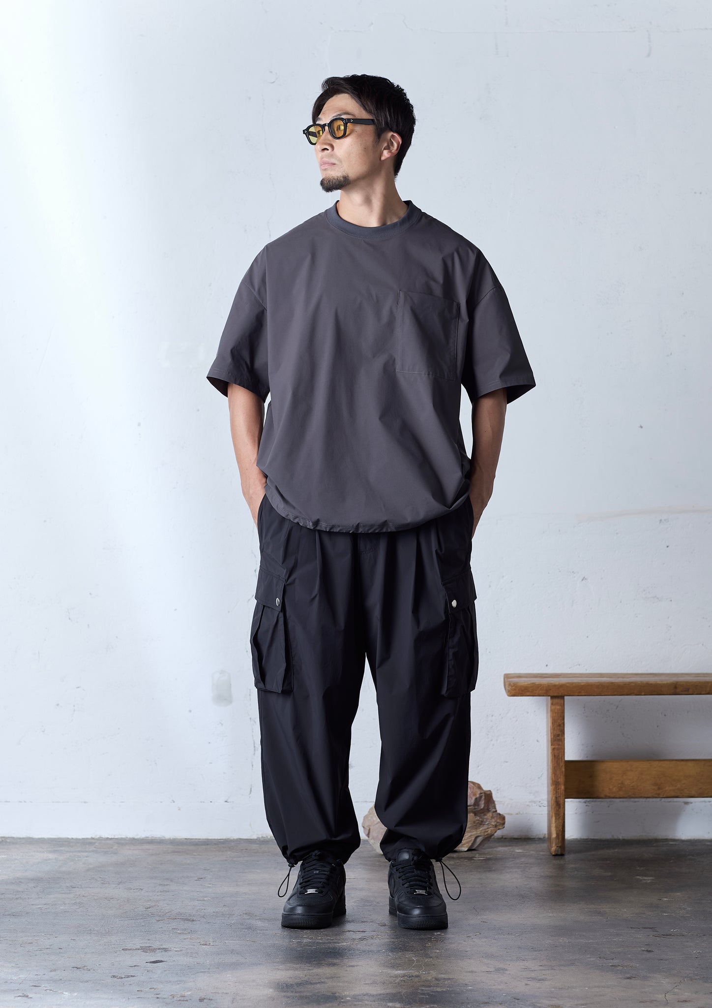 シンプルかつ単調になりがちな夏の装いに映えるよう、カーゴポケットのボタンやウエストの紐の先にはメタルでアクセントを。長ズボンだけど、これなら夏でも履けるかも。そう思えるほどの軽さとマットで高級感のある表情を、ぜひ皆さんにも味わって欲しいです。