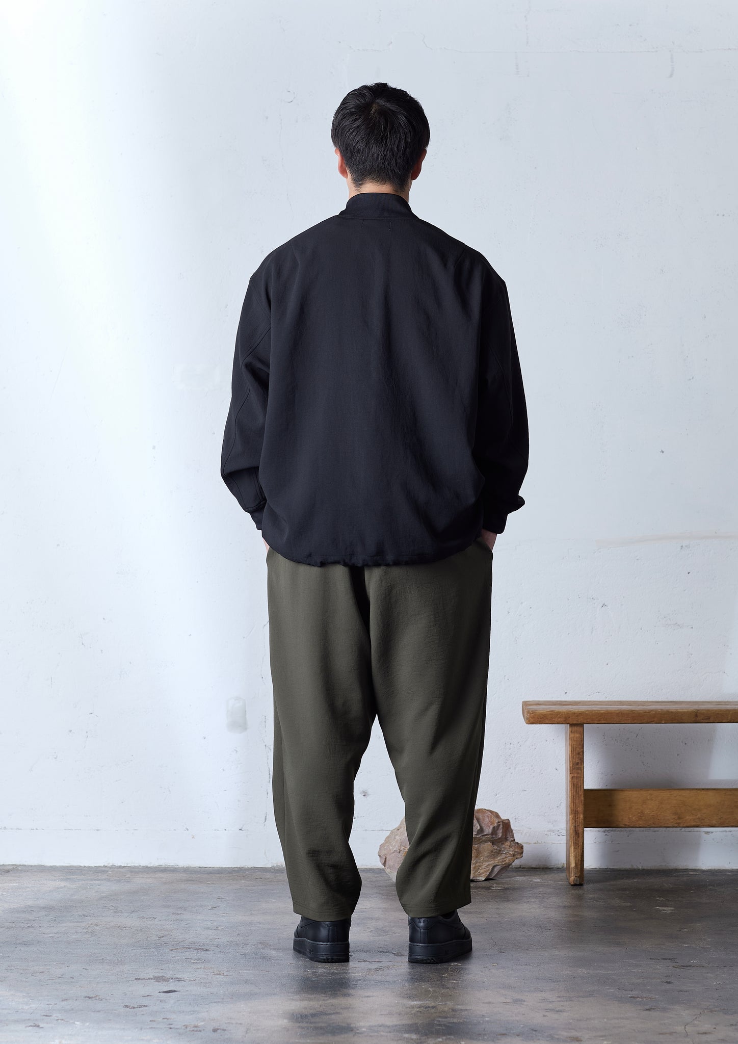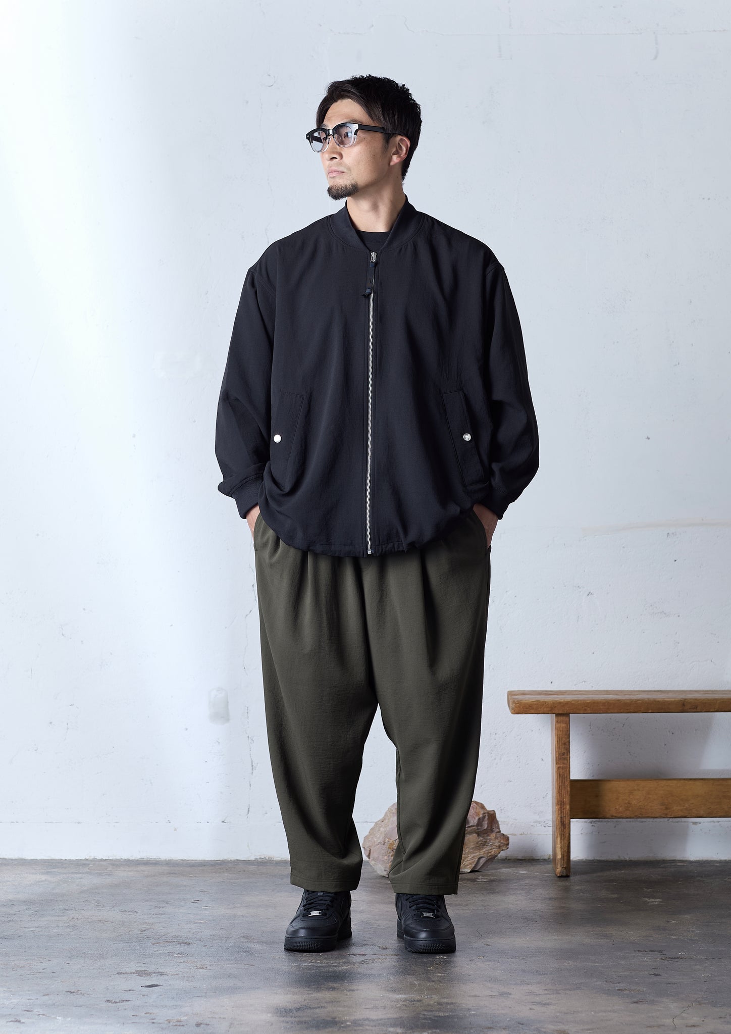 大柄の人が少し肌寒い時に着るためのアウターとして、厚手のものだと逆に暑くなりすぎてしまう。一般的なライトブルゾンのように薄手すぎても、身体のラインを拾ってしまう。だからこそ、薄手ながら、身体のラインを拾いづらい生地を採用しています。少しマットな表情で化繊感が少なく、高級感があるところも気に入っているポイントです。